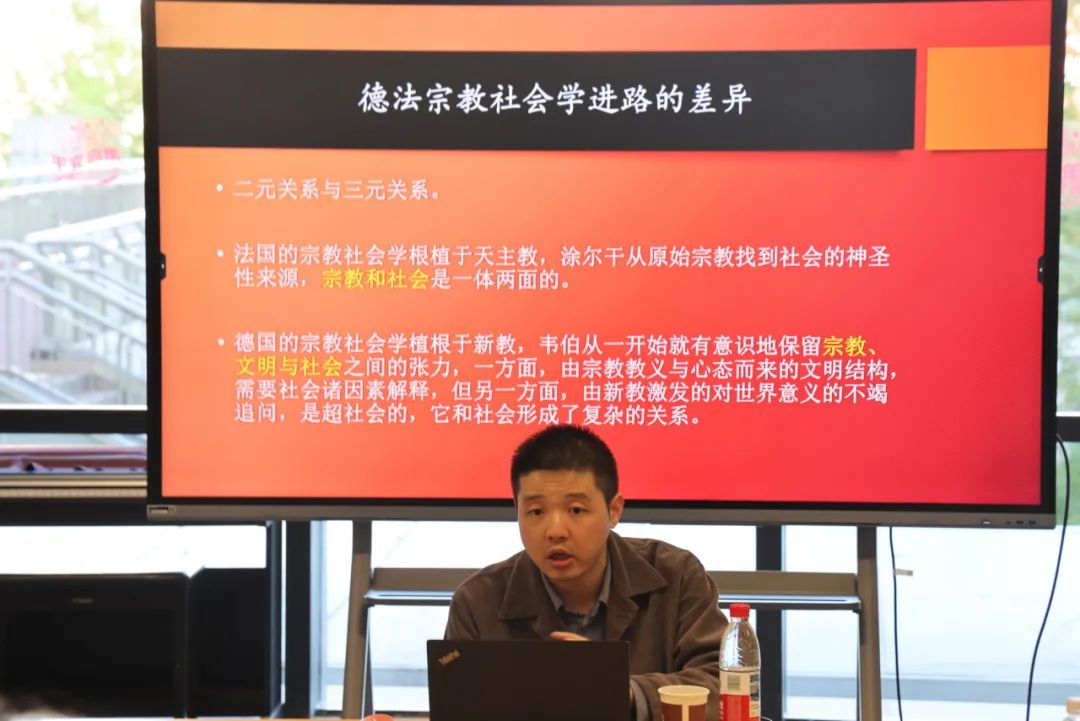 随后张巍卓老师对比涂尔干与韦伯的宗教社会学范式,并指出了两种文明传统的根本分野:涂尔干代表法国天主教传统,主张“宗教-社会”一体两面,认为宗教仪轨与集体意识不可分割,强调社会对个体的强制性规范。而韦伯基于德国新教背景,提出“宗教-文明-社会”动态关系,新教释放的个体动能与社会集体性存在本质冲突,需通过“文明”中介实现联结,凸显三者间的张力与互动。
