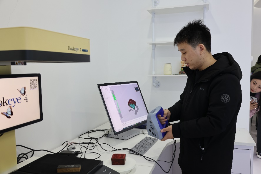 随后,在老师的指导下,同学们亲手操作三维扫描仪器,以特定角度扫描事先准备好的印章实物,并在电脑上运用软件进行处理,初步模型便跃然眼前,大家无不感叹数字前沿技术的魔力。