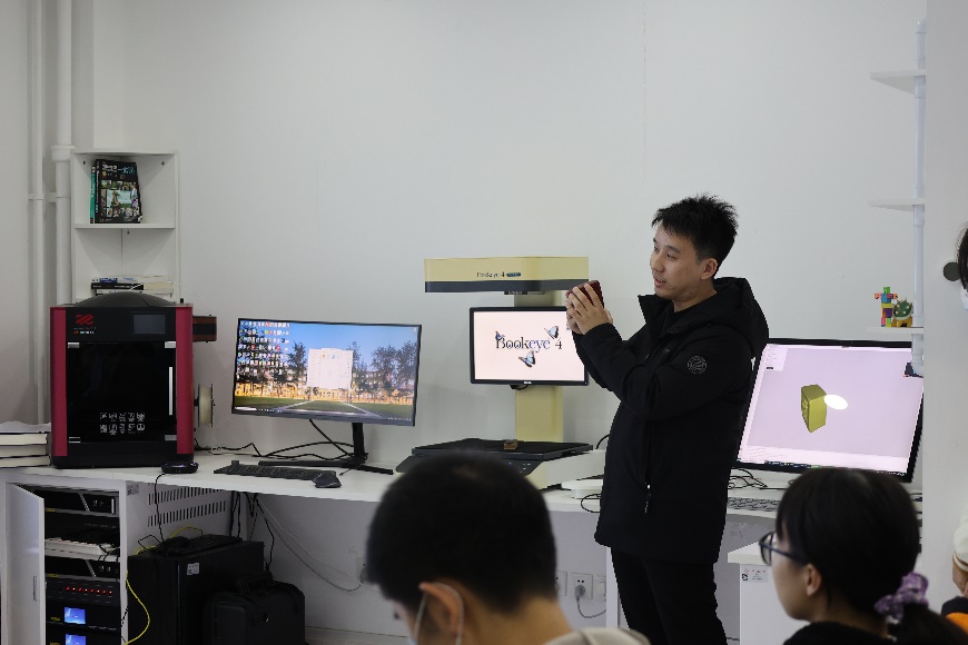 首先,刘力超老师向同学们展示了三维实物建模的一些案例,“北京记忆”作为信管学院数字人文团队负责的主要科研项目之一,通过3D扫描技术以电子档案形式保存了2008年北京奥运会“火炬”“纪念章”等。接着,刘力超老师为同学们讲解3D扫描的工作原理并演示使用设备的具体步骤,详实生动的讲解使大家对三维实物扫描技术有了初步认识。