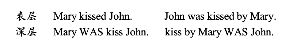 表层结构是Mary kissed John,被动结构是John was kissed by Mary。英语的底层结构应该是有一个系词,这里是大写的“WAS”,来联系两头,这两头是对等项,我最近写了篇文章,下一期《外语教学与研究》就会发表,就是讲我做研究的一个体会,即“英语深层句法结构正是汉语一般的表层句法结构”。为什么这么说?因为汉语的表层结构就是由系词连接的两头的对等项,汉语所有句子的谓语前面都可以加一个“是”字,比如: