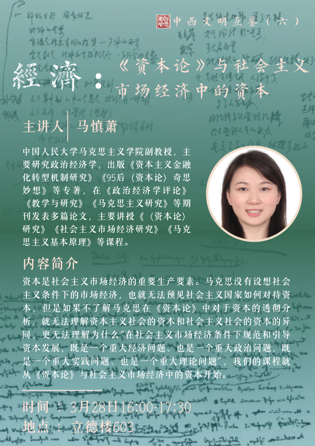 在本课程的第六讲中,我们将与马慎萧老师一起从马克思主义政治经济学出发,探讨新时代重大命题的理论逻辑与实践路径,理解社会主义市场经济的运行规律。