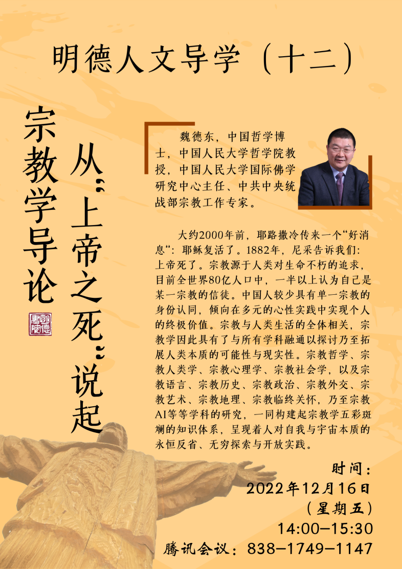 讲座简介:大约2000年前,耶路撒冷传来一个“好消息”:耶稣复活了。1882年,尼采告诉我们:上帝死了。宗教源于人类对生命不朽的追求,目前全世界80亿人口中,一半以上认为自己是某一宗教的信徒。中国人较少具有单一宗教的身份认同,倾向在多元的心性实践中实现个人的终极价值。宗教与人类生活的全体相关,宗教学因此具有了与所有学科融通以探讨乃至拓展人类本质的可能性与现实性。宗教哲学、宗教人类学、宗教心理学、宗教社会学,以及宗教语言、宗教历史、宗教政治、宗教外交、宗教艺术、宗教地理、宗教临终关怀,乃至宗教AI等等学科的研究,一同构建起宗教学五彩斑斓的知识体系,呈现着人对自我与宇宙本质的永恒反省、无穷探索与开放实践。