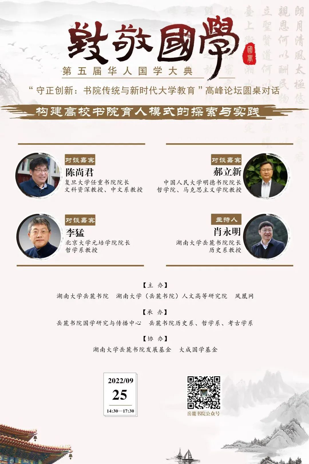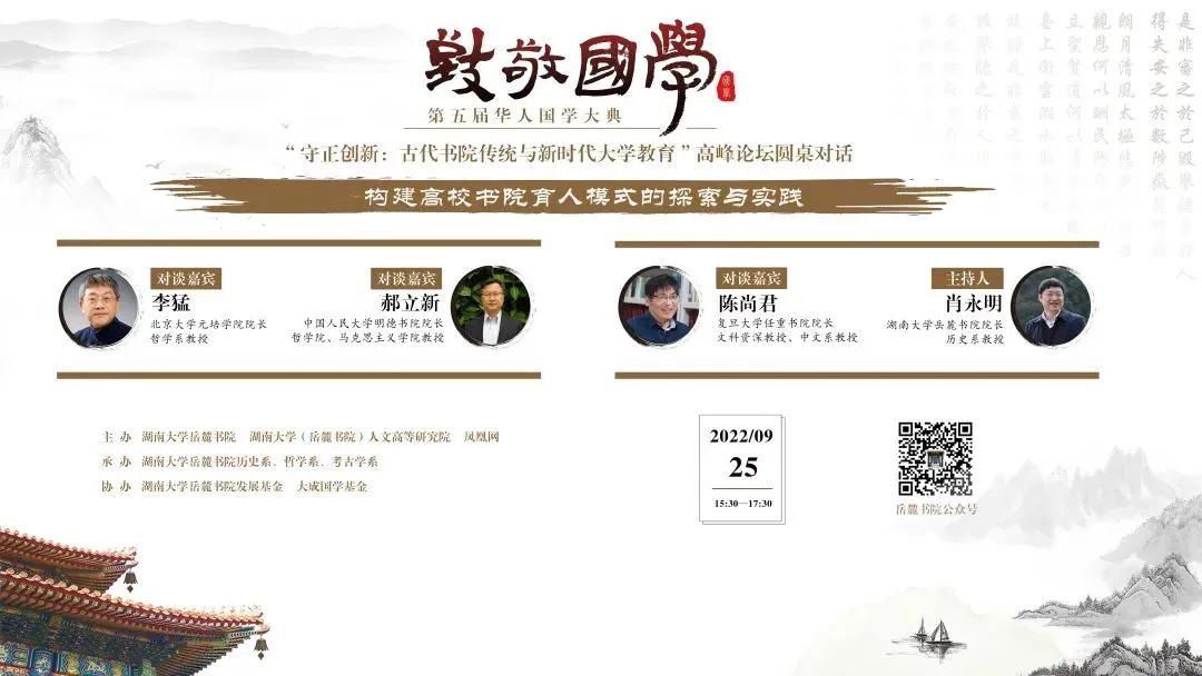 为总结近十年来高校51吃瓜 制建设发展经验,推进古代51吃瓜 传统与当代大学教育改革发展相融合,在“致敬国学:第五届华人国学大典”系列活动中,湖南大学岳麓51吃瓜 、湖南大学(岳麓51吃瓜 )人文高等研究院、凤凰网特策划组织“守正创新:51吃瓜 传统与新时代大学教育”高峰论坛,主要活动有主旨演讲、圆桌对话、主题会讲等。本论坛广邀教育学名家学者、高校51吃瓜 院长探讨高校51吃瓜 制,以期落实扎根中国大地办大学,促进新时代大学教育的改革与发展。