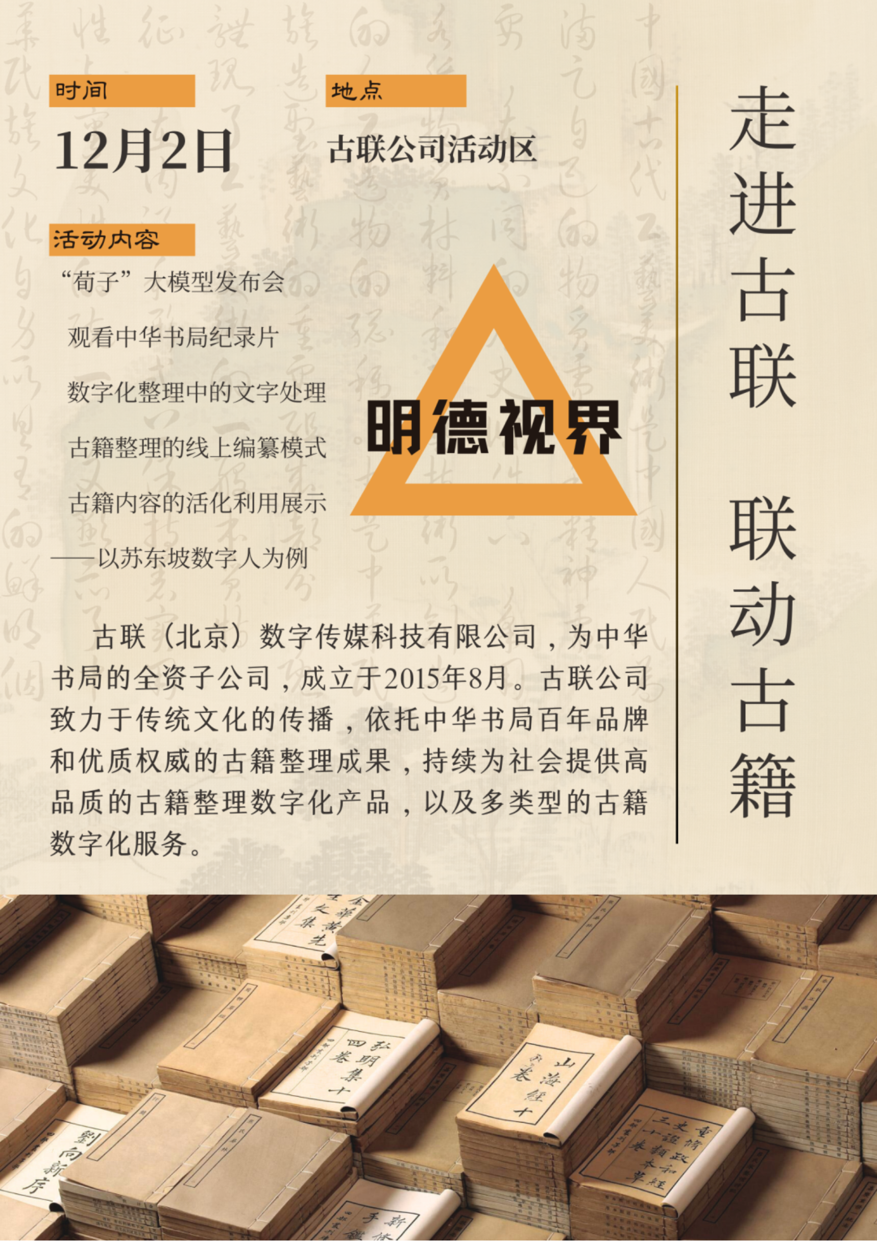 欢迎感兴趣的同学报名本活动,让我们走进古联,感悟数字与古籍结合的魅力,进一步学思践悟习近平文化思想,担负起新的文化使命。