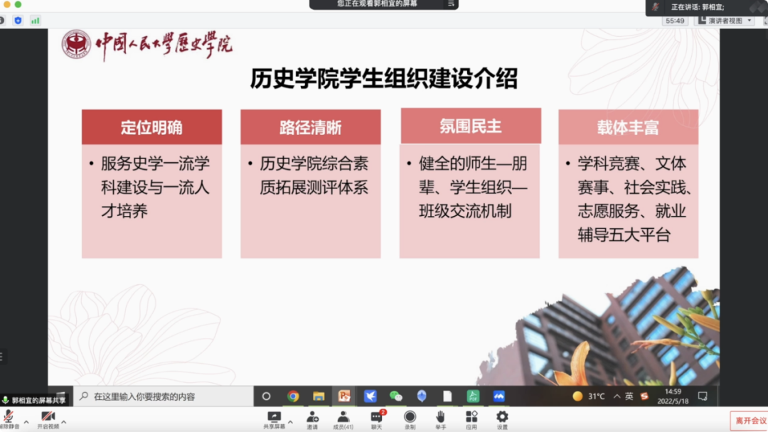 在学生代表分享环节,五位师兄师姐作为受邀嘉宾分享了在历史学院的就读体验和成长收获。