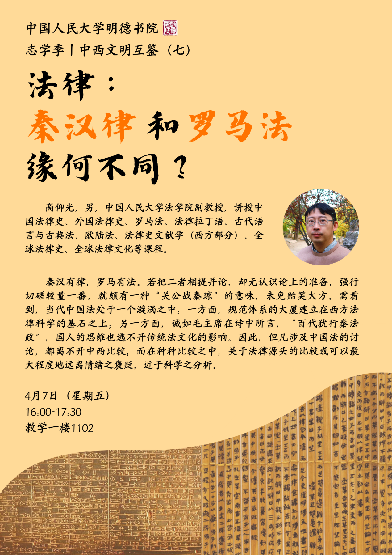 法律的差异深受中西方政治权力结构差异的影响,对封建帝制下中国法落后的极端批判显然并不可取;在文化多元视角下,对中国现代法律体系的构建要求我们深入探究法律源头,汲取全球法文化营养。本周五,让我们循着高仰光老师思考的轨迹,究政法之际,探求秦汉律与罗马法的异同。