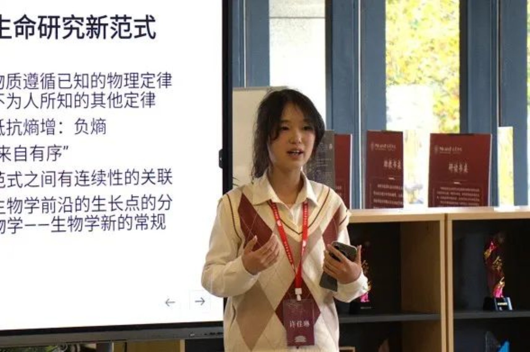 新闻学院2023级国际新闻全英文实验班的许佳琳作了题为《论分子生物学的范式革命——读薛定谔〈生命是什么〉》的读书报告。薛定谔《生命是什么》一书的科学史背景是“已完成的物理学量子力学革命和生物学对遗传物质尚不明确的认识”,并阐明了“生命物质遵循已知的物理定律与尚不为人所知的其他定律”这一观点。报告以库恩的范式理论为脉络,梳理了薛定谔推动分子生物学范式革命的过程,由此映照出科技哲学与其广阔的应用前景。