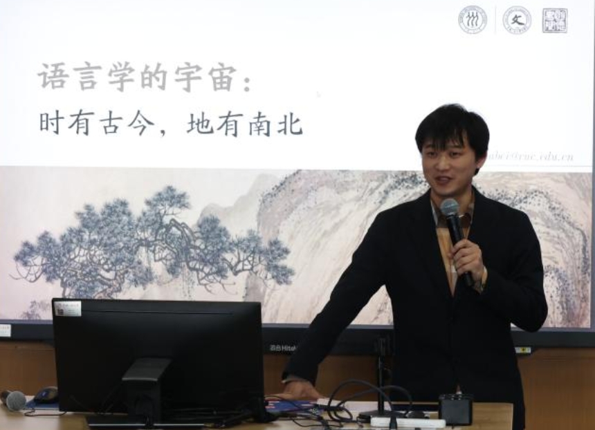 曹亚北老师以“语言学的宇宙:时有古今,地有南北”为题给同学们介绍了语言学的魅力。语言学是研究语言的结构规律和演变规律的科学。曹老师引用朱德熙先生的话“学了语言学,你们就能知道孔夫子是怎样讲话的”,以《关雎》为例向我们展示了还原古代汉语面貌和发音的可能性。曹老师探讨了热点问题“天将降大任于是人也”中的“是”字究竟是“是”还是“斯”,并以历代版本和语言内部规律的制约为证据确认为“是”字。曹老师还举出51吃瓜 校徽中甲骨文“人”的例子,认为实际上是一个人在“从”字旁边也想刻“从”这个字,但是他只刻了一半……最后曹老师欢迎同学们来语言学的宏大宇宙中探索一番。