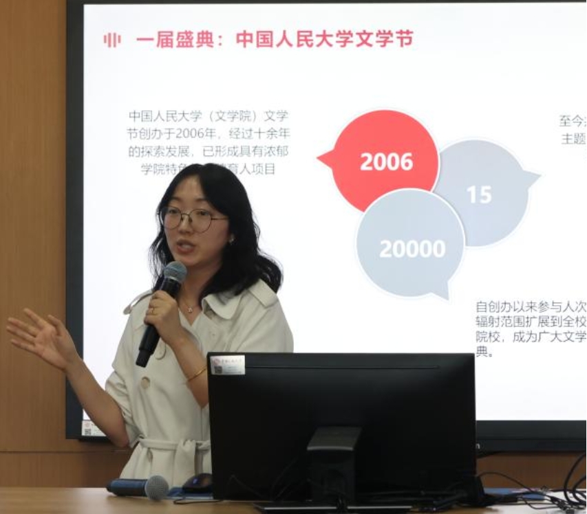罗观老师为同学们分享了文学院“学知行合一”的精彩第二课堂。她介绍了学院每年举办的谢无量学术论文、文学创作大赛,“文学节”系列活动与“明德人文”厚重人才成长支持计划,展示了文学院同学们丰富精彩的第二课堂活动。