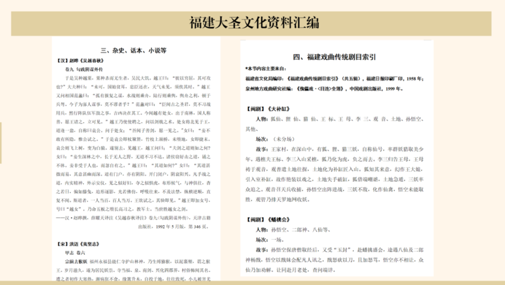 福建大圣文化起源早于《西游记》,历史文献可以追溯到宋代,包含了“前西游”文化基础。在《西游记》成书后,取经故事又再次塑造了福建地方信俗面貌。福建大圣崇拜呈现出“前西游”和“后西游”文化叠加的多元形象。第一部以唐僧取经故事为题材的话本《大唐三藏取经诗话》就诞生在福建;泉州傀儡戏《三藏取经》可追溯到宋元年间,说明闽南地区在“前西游”时代已经有了体系成熟的取经故事。这些话本、戏剧中的西游故事和《西游记》存在较大差异。南平顺昌的乡野间保存了大量明代之前的大圣祭坛遗迹,《西游记》成书后,不少地区的“通天大圣”崇拜也经历了向“齐天大圣”崇拜转化的过程,甚至出现了“齐天”、“通天”并存的现象,这昭示了《西游记》故事对大圣信仰的重新塑造。