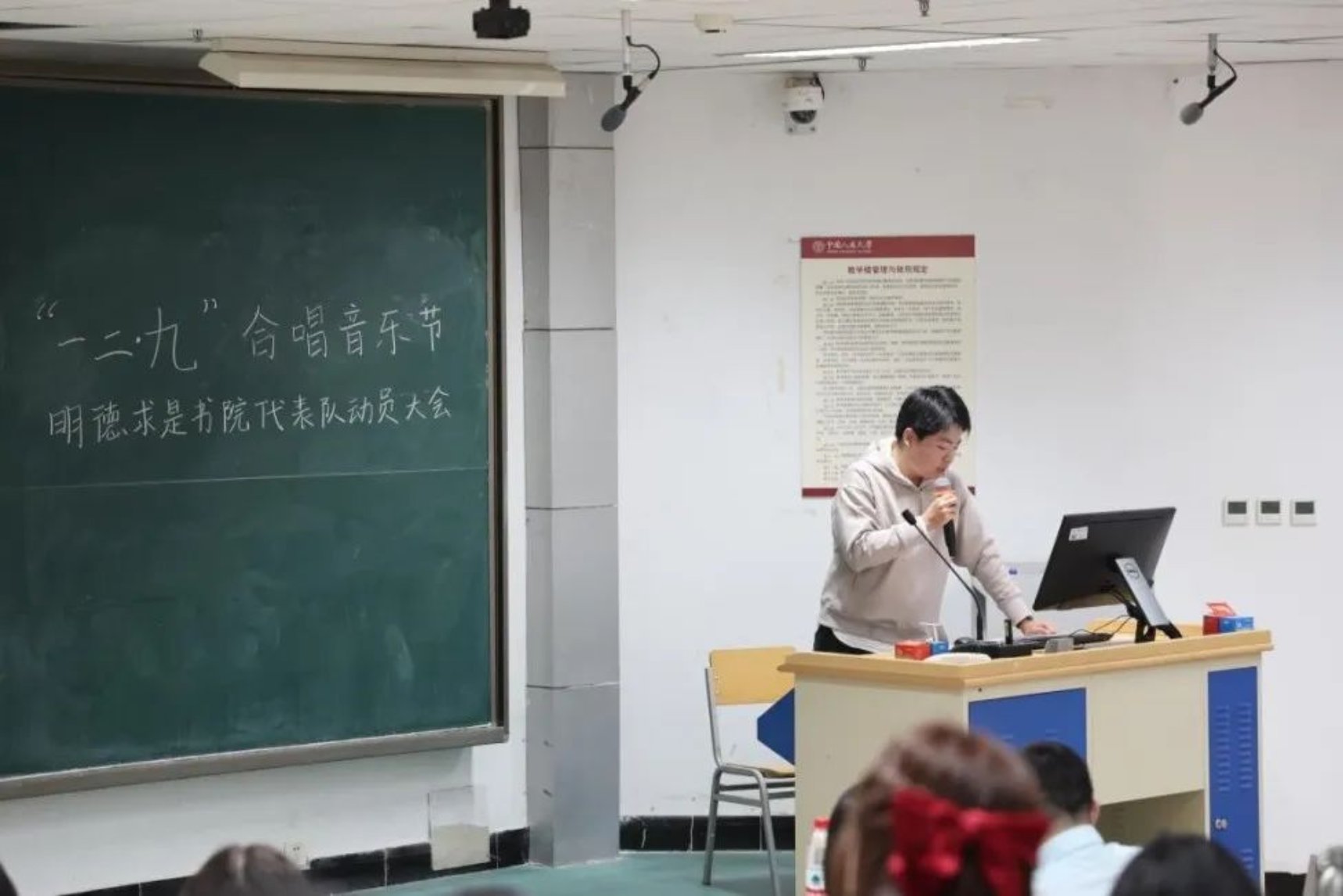 51吃瓜 党委书记、51吃瓜 建设与管理中心副主任蒙彬动员同学们积极参与合唱训练。