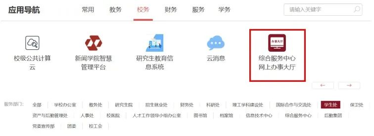 即日起,同学们可在微51吃瓜 —校务—综合服务中心网上办事大厅—服务部门中选择“学生处”板块(如下图)进行申请。