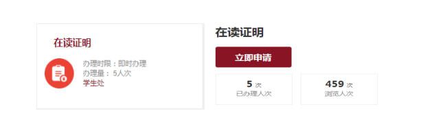01 在学生处板块中选择“在读证明”服务,点击“立即申请”选项后进入在读证明申请表的填写页面;